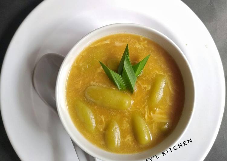 - Didihkan santan, gula merah dan daun pandan. Setelah mendidih masukkan adonan tepung yang telah dibentuk. Masak hingga pengapung lalu tuang larutan tepung beras aduk rata..
